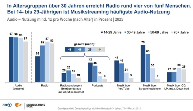 Insbesonde Podcasts erfreuen sich in den Altersgruppen über 30 Jahren steigender Beliebtheit. Bei den 50- bis 69-Jährigen und den über 70-Jährigen stieg die regelmäßige Nutzung sogar signifikant um vier bzw. fünf Prozentpunkte auf 25 bzw. 14 Prozent. Mit 48 Prozent regelmäßiger Nutzung bilden die Die 14- bis 29-Jährigen jedoch nach wie vor die stärkste Nutzergruppe bei Podcasts. Über alle Altersgruppen hinweg stieg die Tagesreichweite 2025 um drei Prozentpunkte auf 14 Prozent.