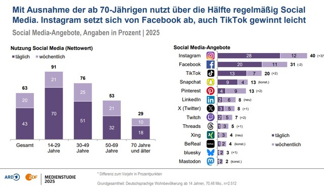 Ein weiterer interessanter Befund der Medienstudie 2025 betrifft die Nutzung von sozialen Netzwerken: Demnach nutzen 63 Prozent der deutschen Bevölkerung nutzen Social Media regelmäßig, das Wachstum verlangsamt sich jedoch. Die Plattform Instagram bleibt mit einer Wochenreichweite von 40 Prozent führend, verliert aber erstmals bei Jüngeren. Facebook folgt mit 31 Prozent, während TikTok in Deutschland auf 20 Prozent wächst.