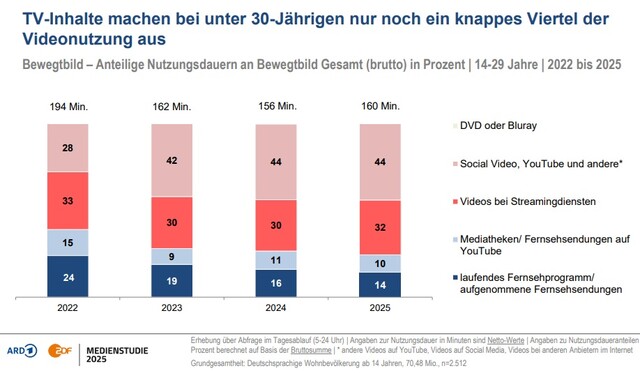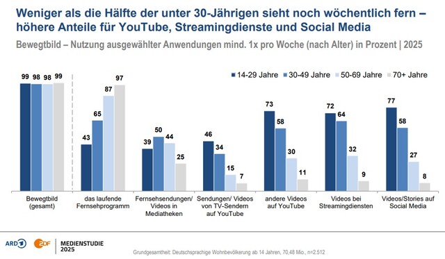 Die ARD-/ZDF-Medienstudie wird seit vielen Jahren von der ARD-/ZDF-Forschungskommission beauftragt, um jährlich Grundlagen und Trends zur Mediennutzung in Deutschland zu erheben. Für die diesjährige Studie wurden 2.512 deutschsprachige Personen ab 14 Jahren in Deutschland befragt - 70 Prozent davon per Telefon auf Basis einer repräsentativen Dual-Frame-Stichprobe, weitere 30 Prozent über ein Onlinepanel. Durchgeführt wurde die Erhebung zwischen dem 28. Januar und 18. April 2025 wurde vom Institut GIM.
