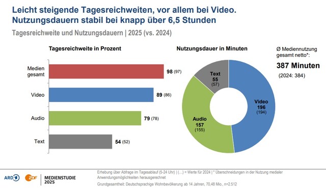 Die gattungsübergreifenden Tagesreichweite ist mit 98 Prozent Gesamtnutzung stabil und die durchschnittliche Mediennutzung liegt bei 6,5 Stunden pro Tag.