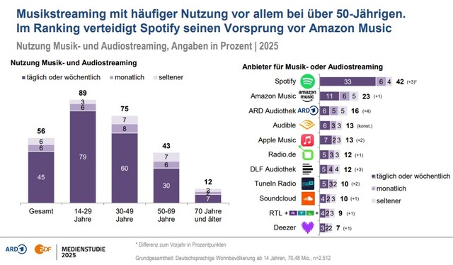 Interessant sind auch die Auswertungen zum Thema Radio und Musik. Demnach hören - wie schon im Vorjahr - 78 Prozent mindestens wöchentlich Radio. Bei den Über-30-Jährigen erreicht Radio vier von fünf Menschen, bei 14- bis 29-Jährigen liegt hingegen das Musikstreaming vorn. Auch die große Mehrheit der Unter-50-Jährigen streamt regelmäßig Musik. Spotify ist hier weiterhin mit großem Abstand der meistgenutzte Anbieter.